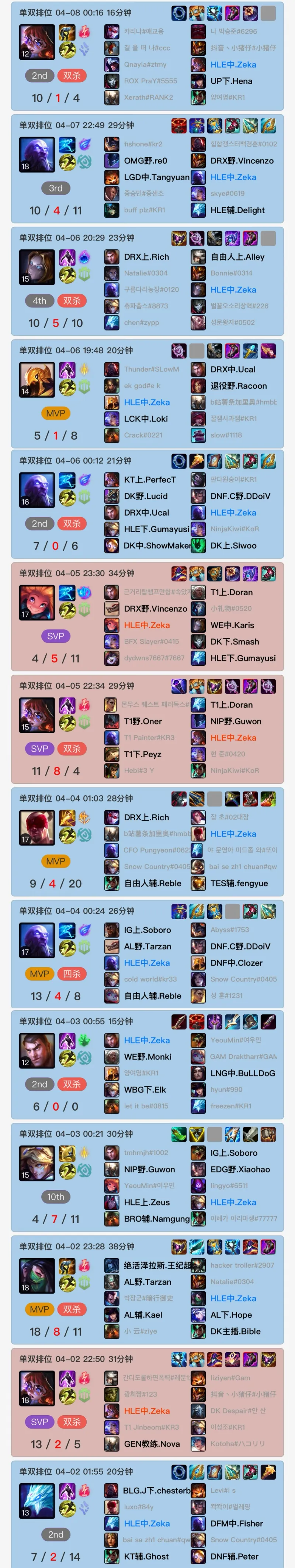 3月底Zeka重回韩服第一后一直霸榜至今,Rank的状态也是猛如虎各种乱杀。而在3月初的时候Zeka已经登顶过一次韩服第一。3月底Zeka重回韩服第一后一直霸榜至今,Rank的状态也是猛如虎各种乱杀。而在3月初的时候Zeka已经登顶过一次韩服第一。...